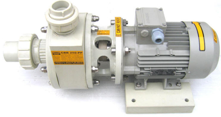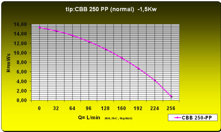 TEHNIČNE INFORMACIJE : : CBB | | Črpalke: | CBB 250 PP | | Moč motorja/: | 1.5 kW 3X400V SIEMENS | | Max pretok: | 250 l/min | | Max.tlačna višina: | 15 mVS | | Max. kinem.viskoznost | 114 mm/s2 | | Material črpake /ohišje/gred/prevleka | polipropilen/st52/pp | | Max temp medija: | 80 C | | Dim sesalne cevi: | DA 50 mm | | Dim tlačne cevi : | DA 40 mm | | Tesnenje | Ptfe + SiC/SiC | | | 22 kg | | izvedbe: | PP ali PVC | | Način priklopa tlač cevi | holandec prirobnica ali smerekica |