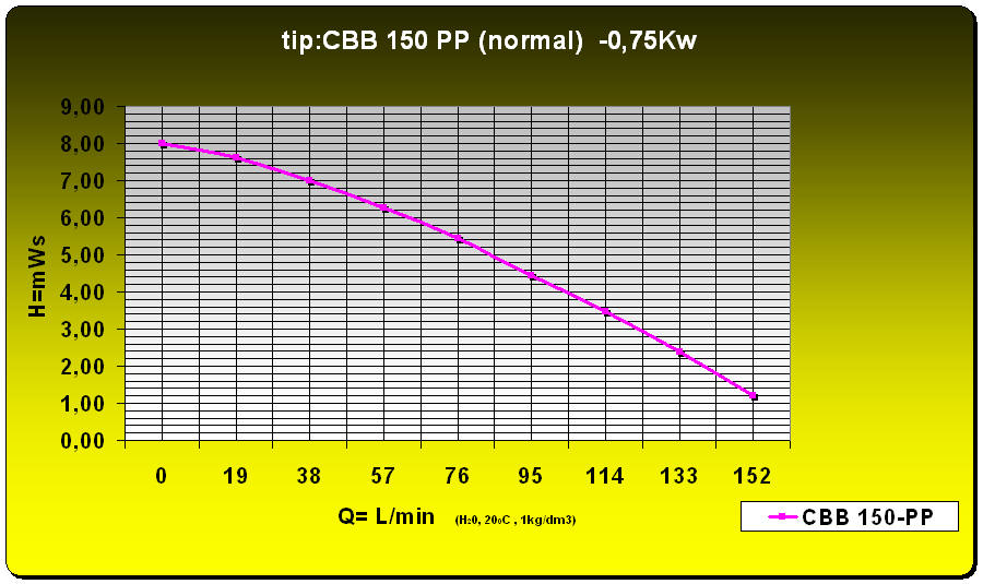 TEHNIČNE INFORMACIJE : : CBB | | Črpalke: | CBB 150 PP | | Moč motorja/: | 0.75 kW 3X400V SIEMENS | | Max pretok: | 150 l/min | | Max.tlačna višina: | 8 mVS | | Max. kinem.viskoznost | 114 mm/s2 | | Material črpake /ohišje/gred/prevleka | polipropilen/st52/pp | | Max temp medija: | 80 C | | Dim sesalne cevi: | DA 40 mm | | Dim tlačne cevi : | DA 32mm | | Tesnenje | Ptfe + SiC/SiC | | | 17 kg | | izvedbe: | PP ali PVC | | Način priklopa tlač cevi | holandec prirobnica ali smerekica |