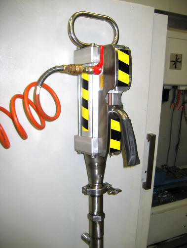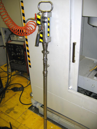 OPIS .Priklop na omrežje je z pnevmatsko spojnim vtikačem Črpalko vklapljamo preko ke na črpalki. Z ko lahko krmilimo tudi pretok . Priklop cevi za izpustni tlačni cevovod je izdelan tako da ga z dvovijačnikom privijete na črpalko. Izvedba je popolnoma ročna.