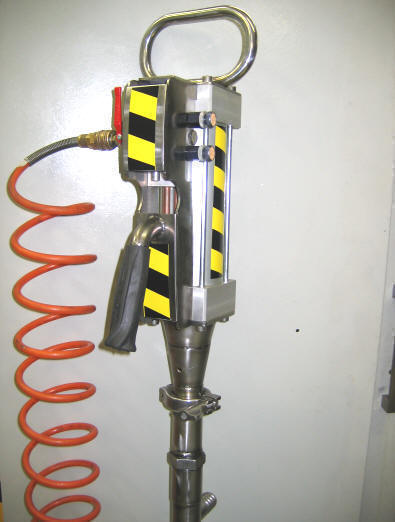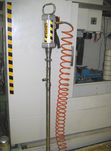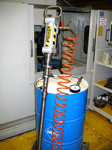 Deluje na način, da teflonski/inox bat preko dveh nepovratnih ventilov in pnevmatskega pogona porine tekočino skozi tlačno cevpogonski motor je pnevmatski in deluje po cca sek taktu gor dol .preklaplja samodejno. Preko dušilk nastavimo hitrost obratovanja.
