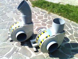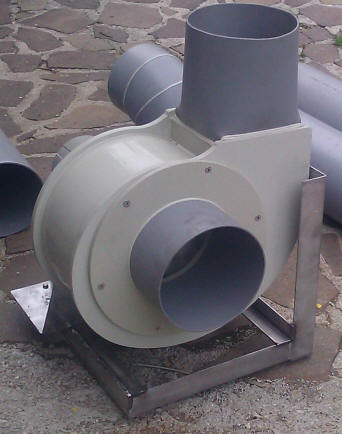 Popolnoma plastična izvedba centrifugalnega radialnega ventilatorja izdelanega iz polipropilena zaradi odličnih mehanskih temperaturnijh in proti kemičnim uplivom odpornih lastnosti. Sama konstrukcija je izdelana iz kislinsko odpornega nerjavečega jekla kvalitete W.Nr. 1.4571 s prigrajenim asinhronskim elektromotorjem. Vsi deli ki pridejo v stik z fluidom so izdelani iz polipropilena.